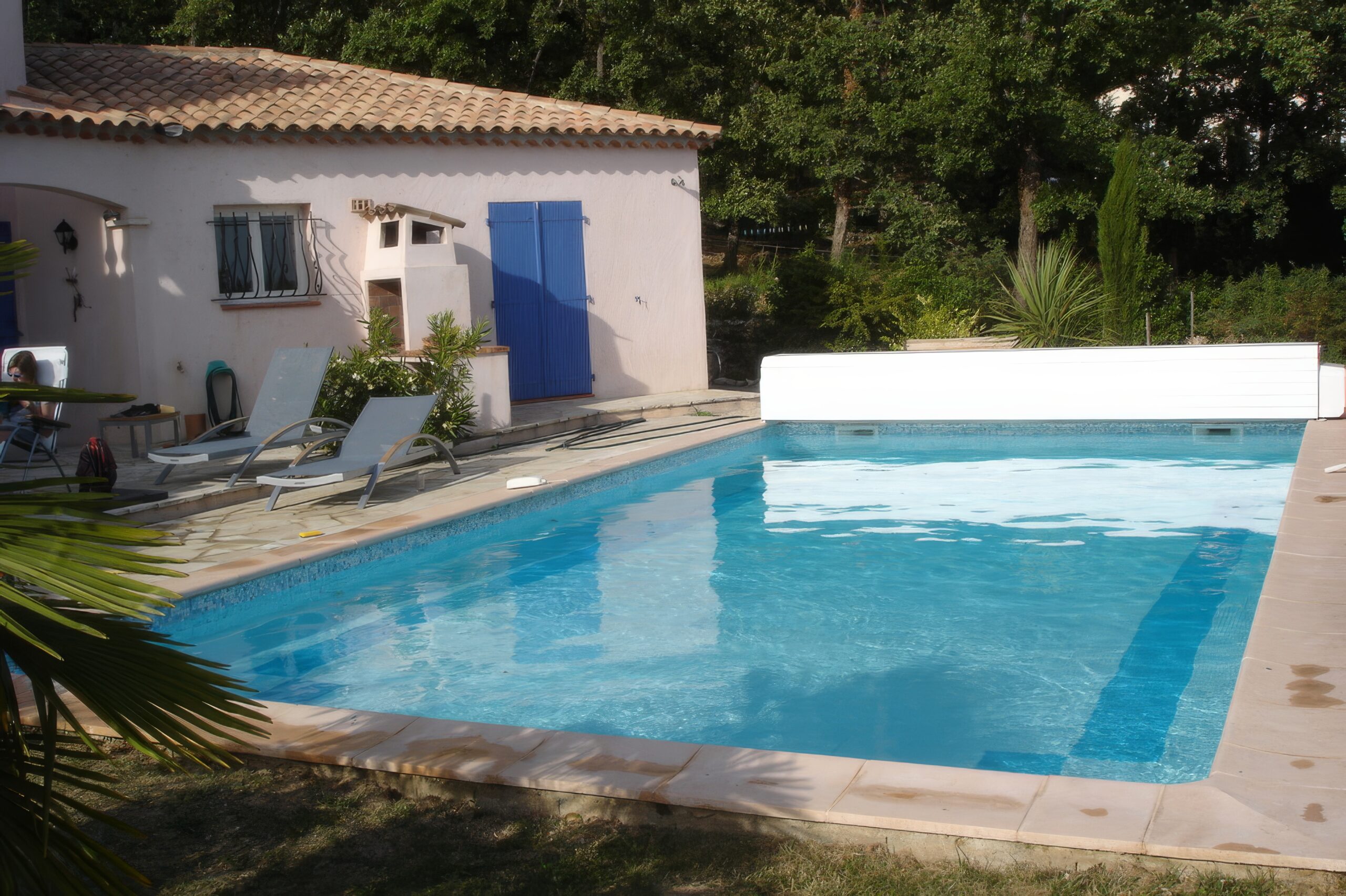 Buiten is er een groot terras aan het zwembad, met ontbijttafel, ligstoelen en parasol. Het tweede terras ligt aan de westzijde van het huis en is overdekt.Er is een barbecue en een sauna. Voor de sportievelingen is er een tafeltennis en een petanquebaan.